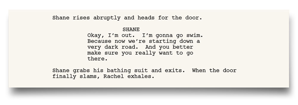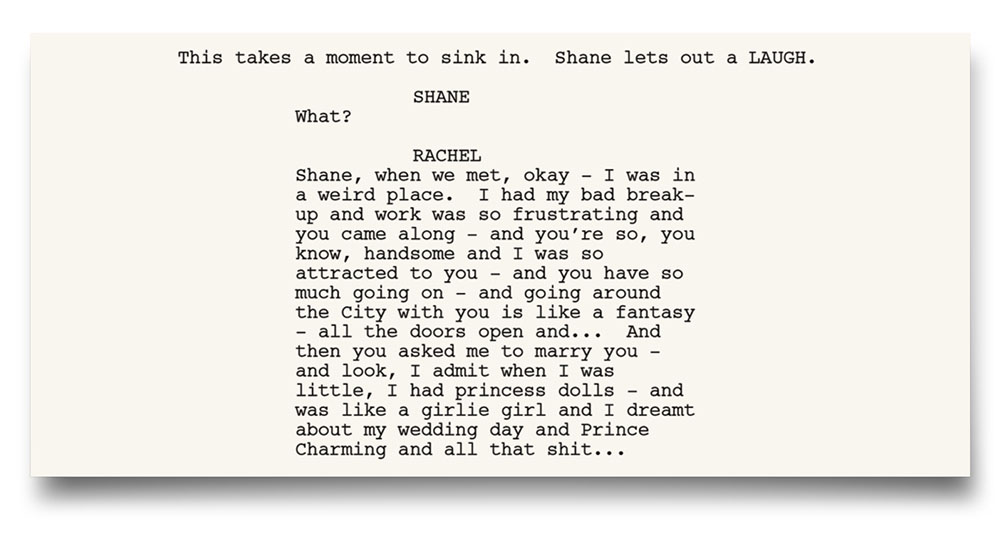 Bien qu’il s’agisse, en théorie, d’une scène de rupture, le spectacle se termine avec Shane et Rachel de retour ensemble avant de rentrer chez eux. Ce moment était une nécessité pour cette conclusion narrative. « Rachel peut avoir de l’indépendance et [be] quoi qu’elle puisse être, mais elle est toujours un appendice pour lui », dit White. « Elle ne peut pas avoir tous les attributs de sa vie et de son style de vie sans une sorte de sacrifice de pouvoir. »
