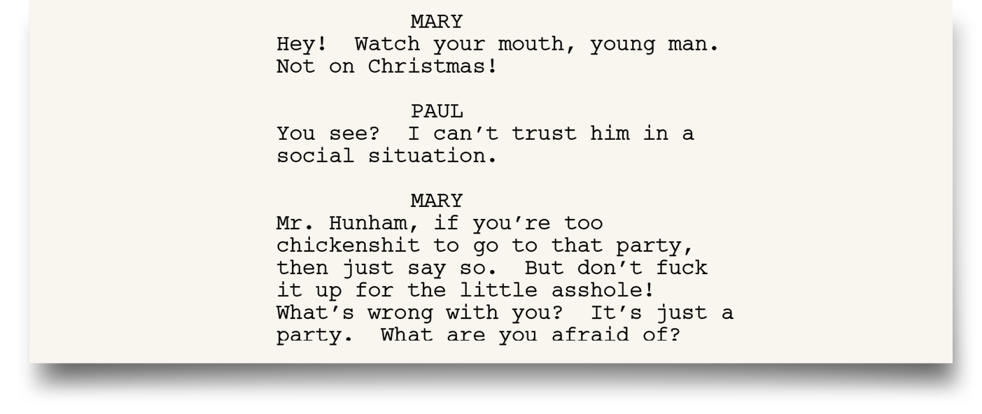 «Nous voyons Paul se lier à Mary, mais elle est [growing] J’aime aussi Angus », explique Hemingson. Leur mépris commun pour les étudiants privilégiés de la Barton Academy établit leur intimité tout au long du film. Bien qu’Angus fasse partie de ces « petits connards qui ne font que se plaindre », sa présence pendant les vacances adoucit les sentiments de la mère en deuil à son égard, en particulier dans cette scène, lorsqu’elle prend sa défense.
