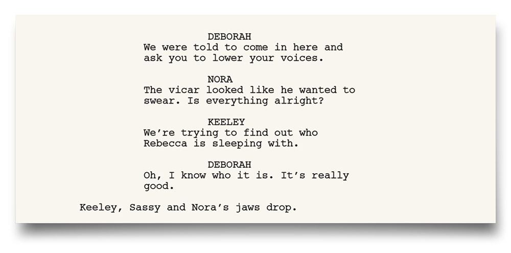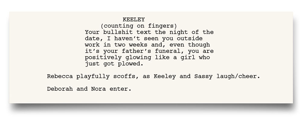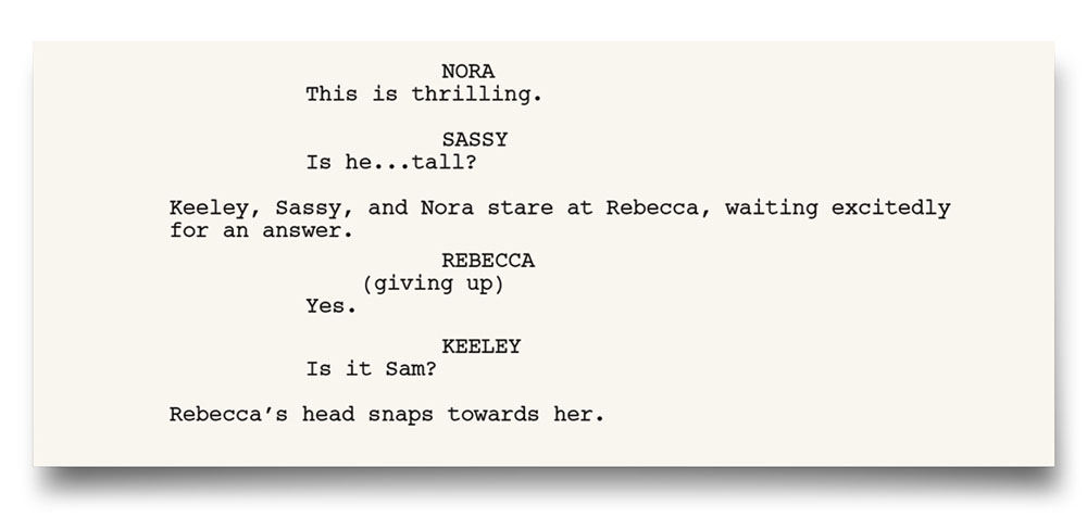 En plus d’écrire une scène centrée sur des personnages féminins, ce moment met en relation un groupe de femmes d’âges variés – « trois générations solides » comme le souligne Becker. « Je n’ai jamais écrit une scène où un groupe multigénérationnel de femmes a une conversation, et c’est amusant et il n’y a pas beaucoup de drame ou quelqu’un n’a pas blessé quelqu’un », dit-elle. Mais si la scène manque de tension, elle se rattrape par la joyeuse camaraderie entre Rebecca et ses proches. « Il se passe beaucoup de choses intéressantes. »