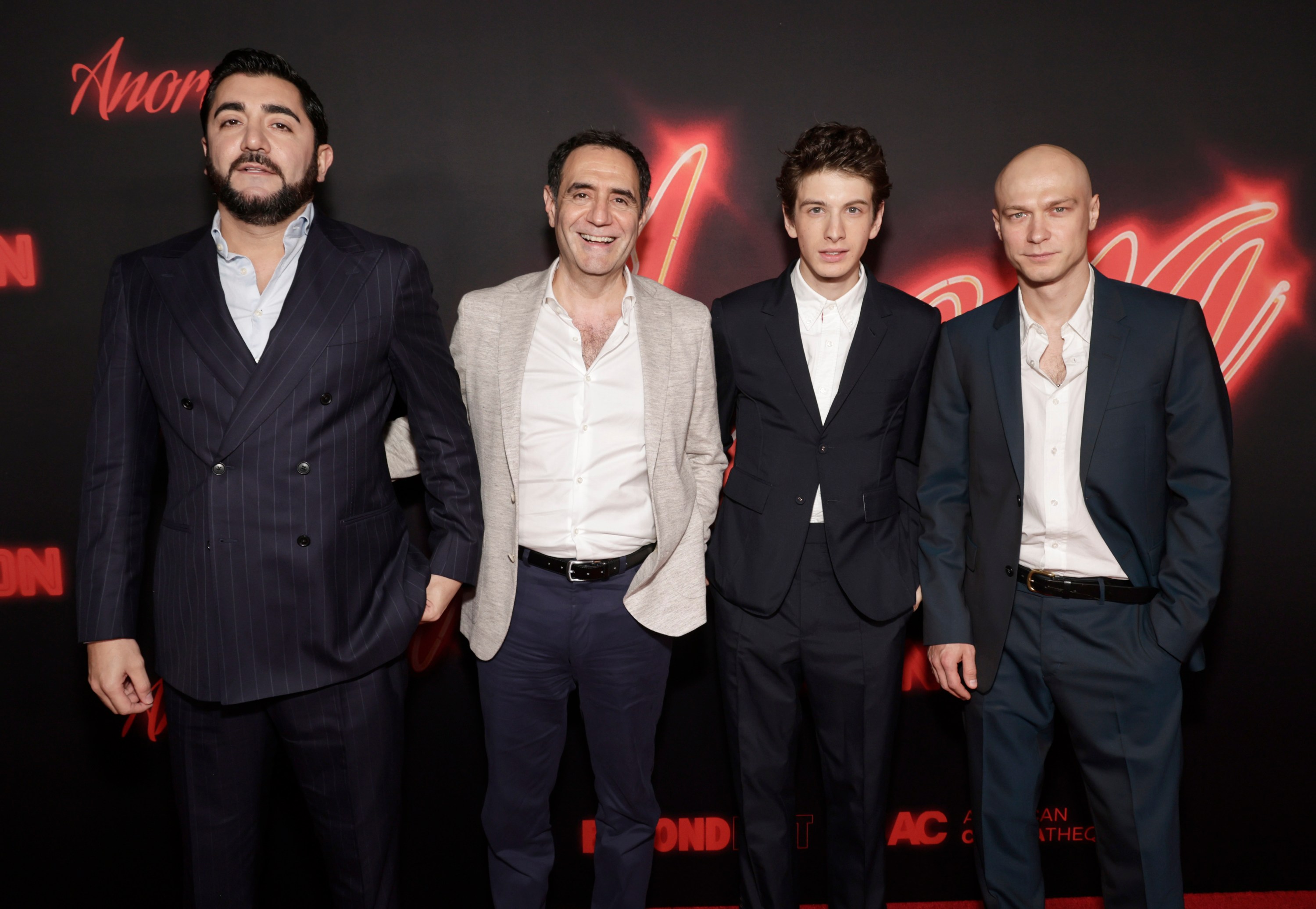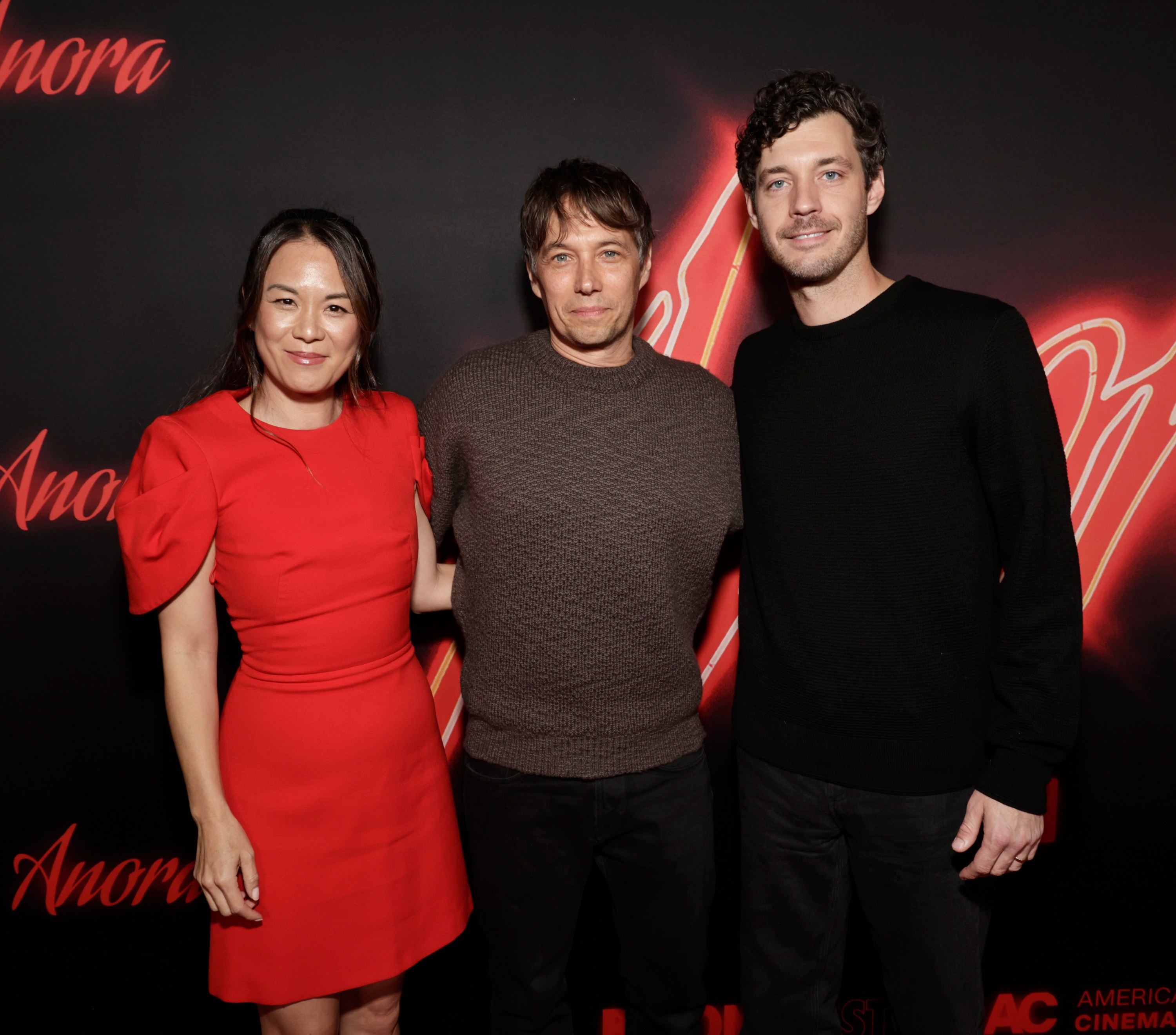 Équipe Anora: Vache Tovmasyan, Samantha Quan, Sean Baker, Karren Karagulian, Mikey Madison, Yura Borisov, Mark Eydelshteyn et Alex Coco devant le Vista Theatre de Los Angeles pour la première du Beyond Fest.